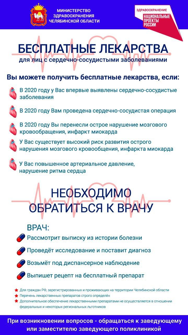 На территории Челябинской области с 2020 года реализуется пилотный проект для граждан РФ, зарегистрированных и проживающих на территории Челябинской области. Целью дополнительного обеспечения лекарственными препаратами является профилактика развития сердечно-сосудистых заболеваний и сердечно-сосудистых осложнений.