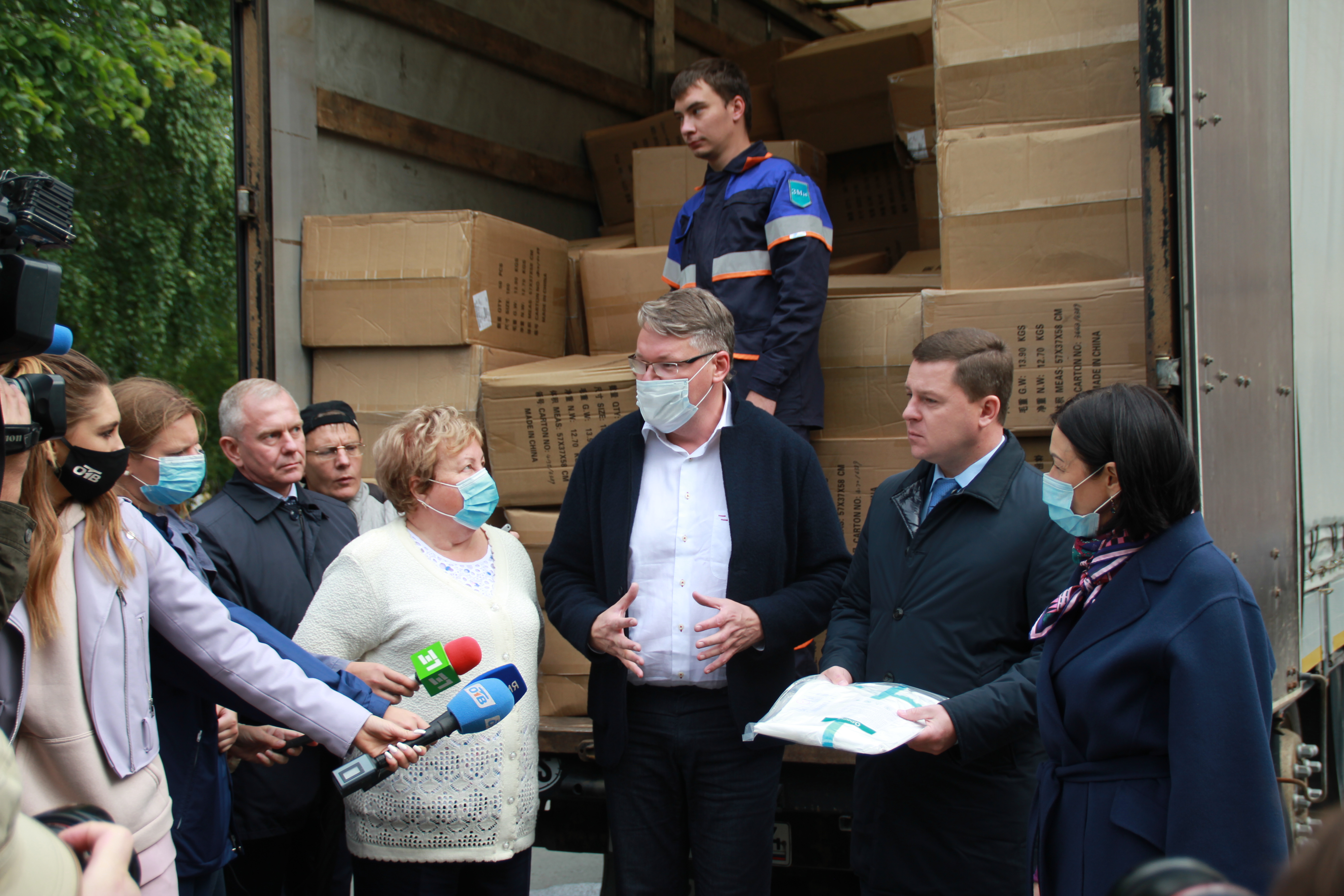 18 августа на территории Областной клинической больницы № 2 встречали фуру с 60 кубометрами ценного груза. Благотворительную помощь принимали главные врачи медучреждений, куда поступят СИЗы, мэр города Наталья Котова, заместитель министра здравоохранения Челябинской области Евгений Ванин и генеральный директор ООО «Новатэк-Челябинск» Вадим Ромасенко.